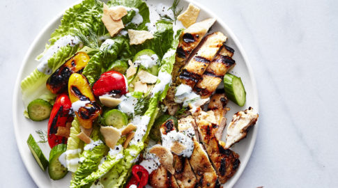 Real Simple October 20175 Easy DinnersCHICKEN GYRO SALAD WITH TZATZIKI DRESSING